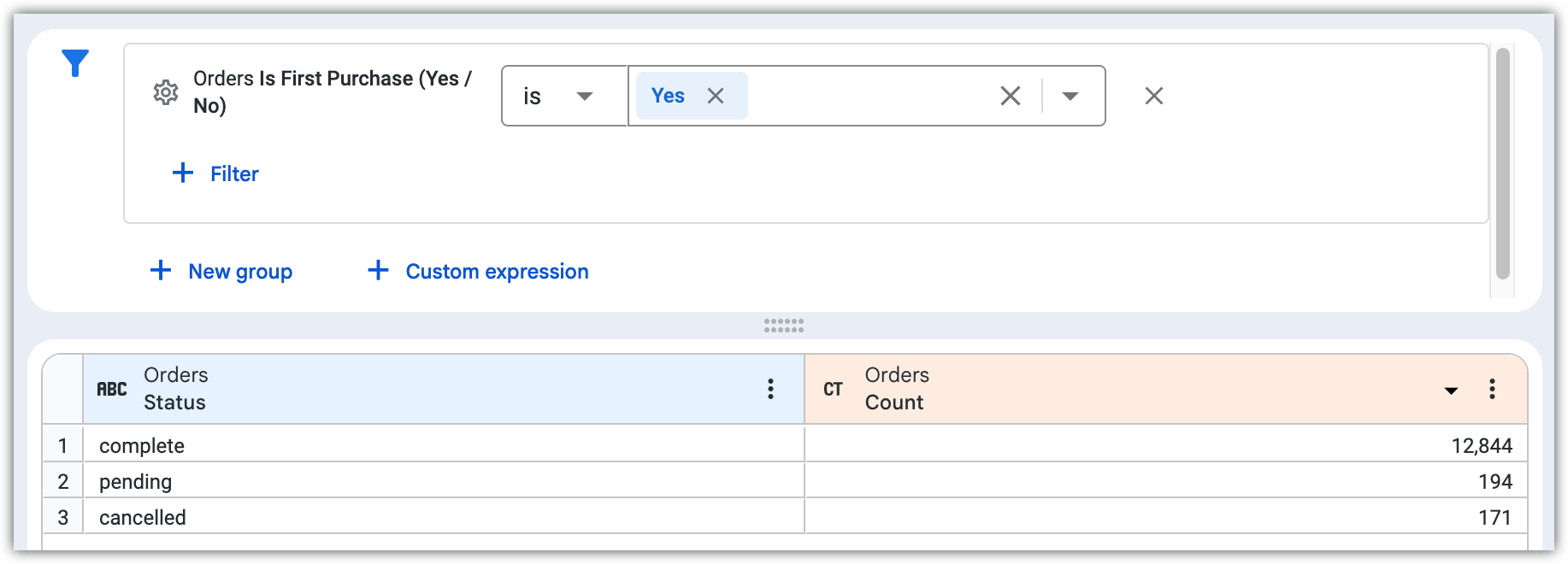 Looker removes all orders that are not first-time orders from the results. The Orders Count measure still counts the orders for each status, but the measure values are lower than if the filter wasn't applied.