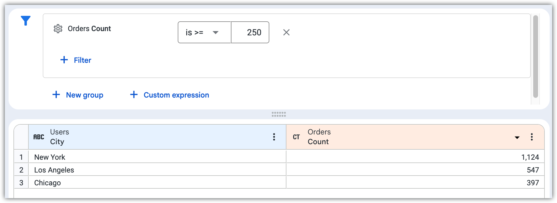 For example, say you've created an Explore to view how many orders were placed by city. The Explore includes the Users City and Orders Count fields. Then, you add a filter on the Orders Count measure with the condition is >= 250.