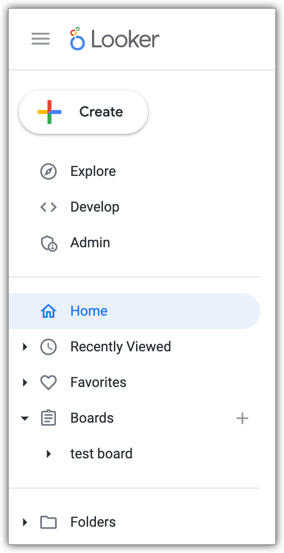 Inicio: muestra tu página principal si tu administrador de Looker ha habilitado la página principal prediseñada u otra opción de página principal. Si tu administrador ha definido un tablero como página principal, aparecerá el nombre del tablero en lugar del texto Inicio.