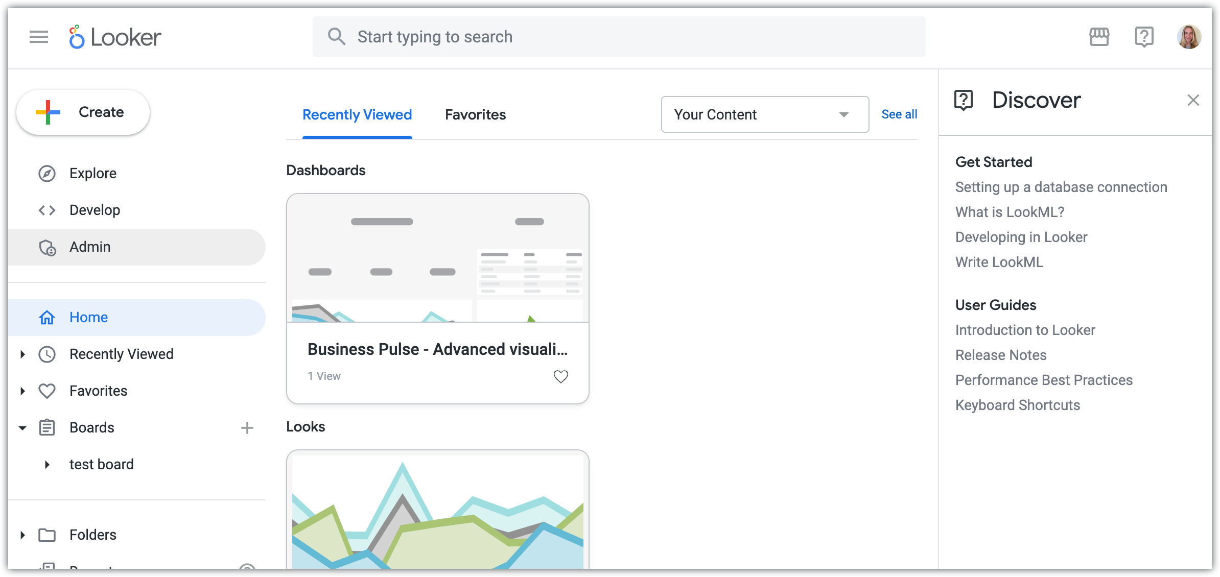 Uma página do Looker: o seu administrador pode definir a página inicial para outra página no Looker. Por exemplo, se a sua página inicial tiver sido definida como a página Favoritos ou Visualizados recentemente, verá essa página quando iniciar sessão no Looker. A opção Página inicial no menu de navegação principal também é substituída por uma referência a essa página.