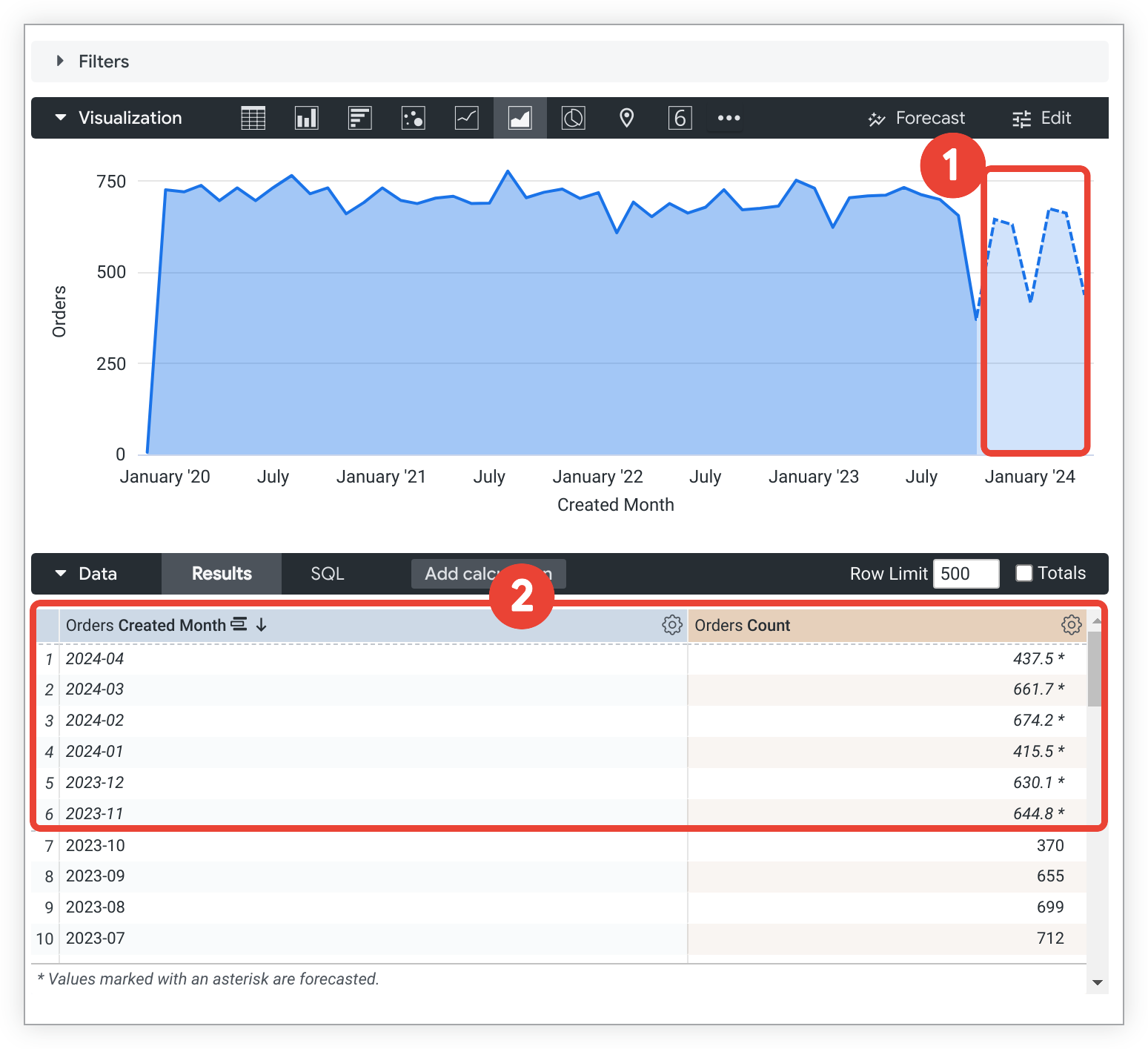 Las previsiones permiten a los analistas añadir rápidamente proyecciones de datos a consultas de Exploración nuevas o ya creadas para ayudar a los usuarios a predecir y monitorizar puntos de datos específicos. Los resultados y las visualizaciones de Exploraciones pronosticadas se pueden añadir a los paneles de control y guardar como Looks. También se pueden crear y ver resultados y visualizaciones previstos en el contenido de Looker insertado.