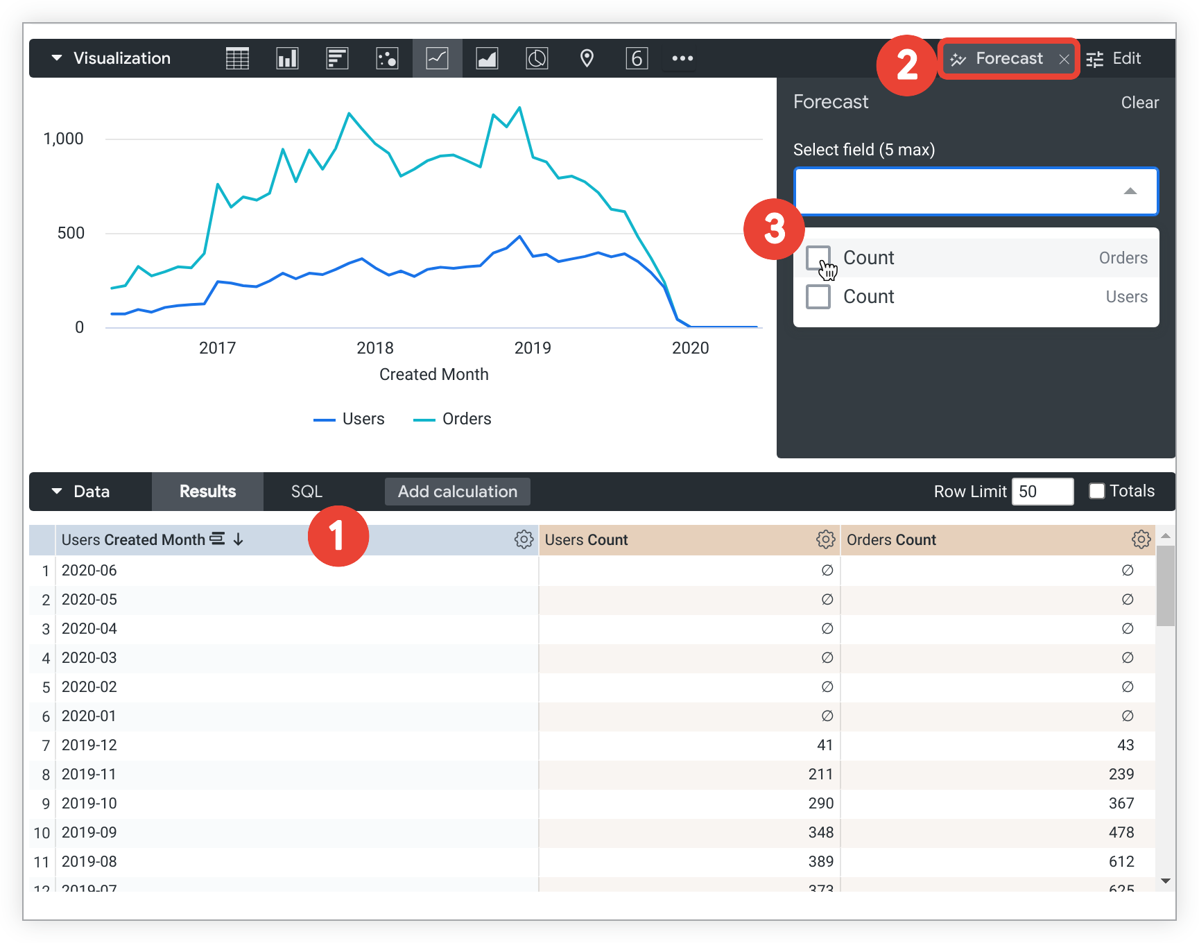 Asegúrate de que tu Exploración cumpla los requisitos de previsión. Por ejemplo, un usuario quiere crear una previsión para una consulta de Exploración con Mes de creación de usuarios, Número de usuarios y Número de pedidos, ordenada por Mes de creación de usuarios en orden descendente. Los resultados muestran datos hasta diciembre del 2019.