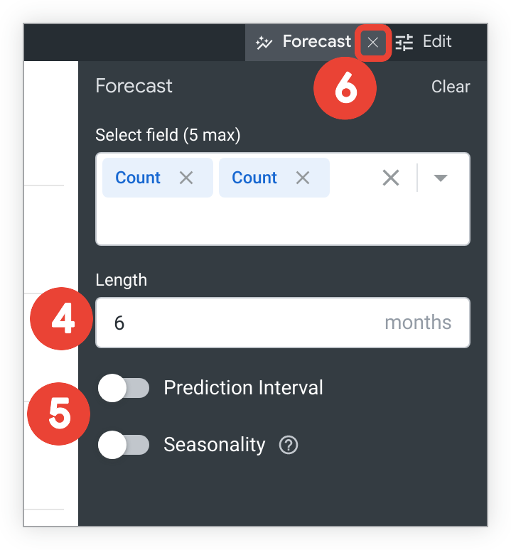 - Si ya se ha habilitado Intervalo de predicción o Estacionalidad, se mostrarán las personalizaciones. Edita los ajustes personalizados como quieras o selecciona el interruptor para quitar la función de la previsión.