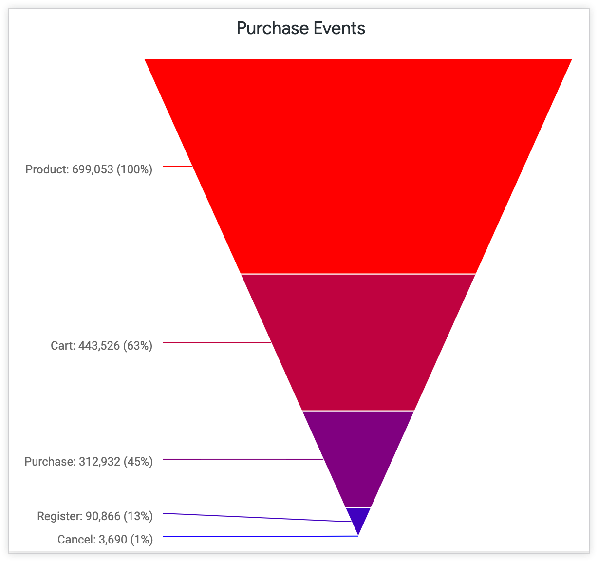 ファネル チャートは、セールス パイプラインにおける見込み顧客の段階、マーケティング キャンペーンへの関与、ウェブサイトでの訪問者の動きなど、一連のプロセスにおけるイベントを理解するうえで役立ちます。