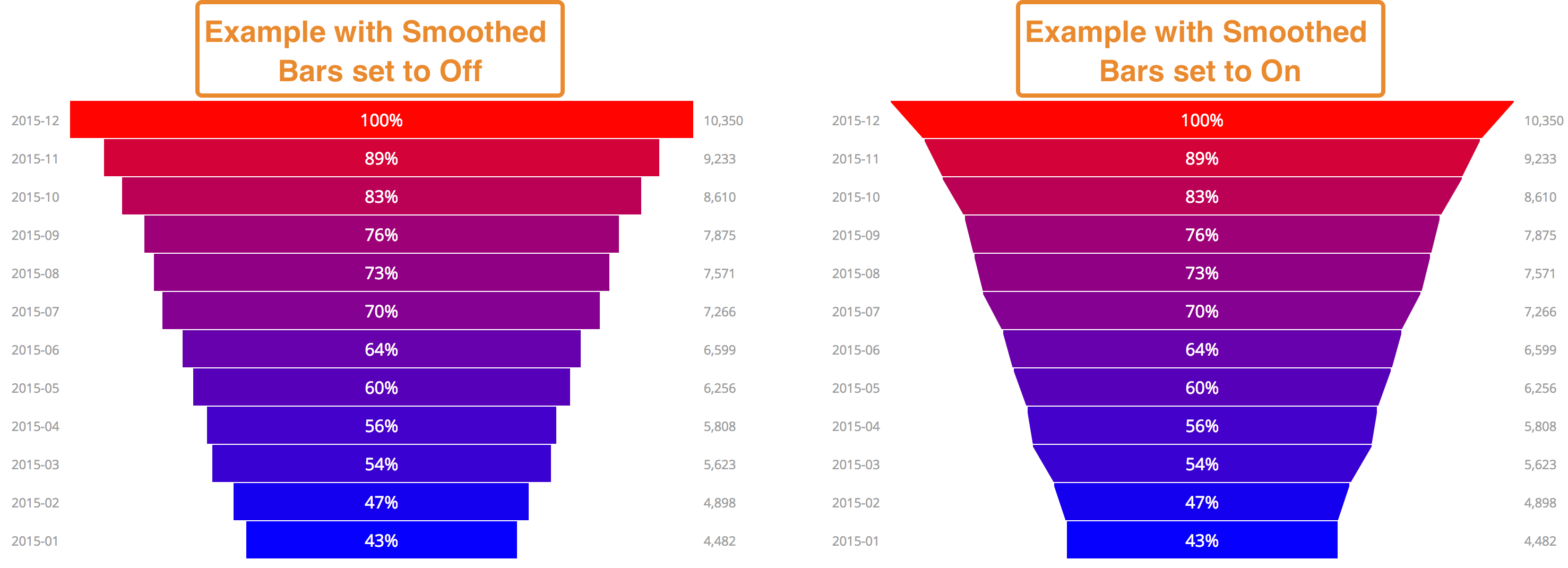 계단식 유입경로 차트에서 평탄화 막대는 유입경로 차트에 있는 각 막대의 외부 가장자리와 그 위에 있는 막대를 부드럽게 연결할지 여부를 전환합니다. 매끄러운 막대를 사용 중지하면 막대가 직사각형 모양이 됩니다. 매끄러운 막대를 사용 설정하면 막대 가장자리가 서로 연결되도록 부드러워집니다.