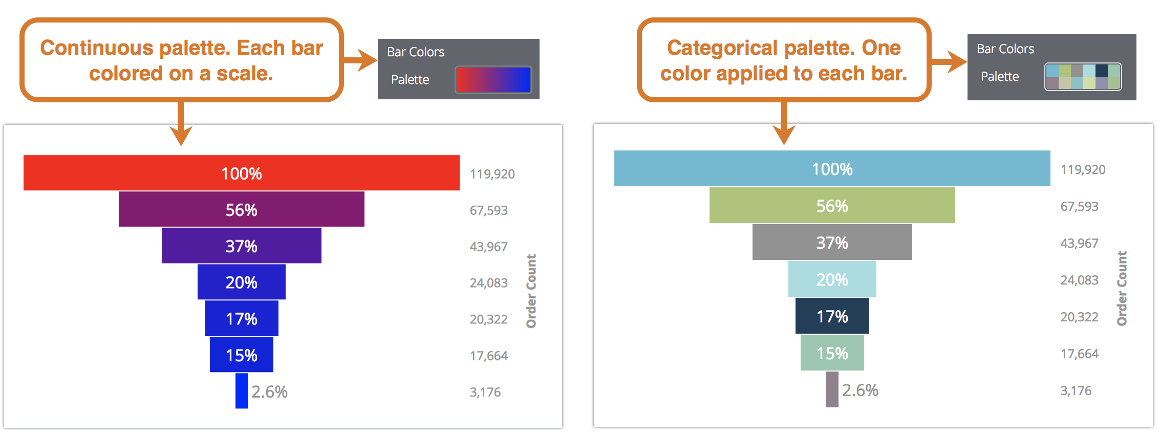 If you use a sequential or diverging palette, each bar is colored on a scale along the palette. If you change to a categorical palette (a palette composed of multiple individual colors), colors are assigned to each bar in order. The first bar is assigned the first color, and so on. If there are more bars than colors listed, the colors repeat from the beginning of the palette.