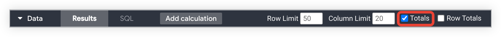 The arrow to the right of the Row Totals checkbox lets you toggle the placement of the totals column between the far right default placement and a placement further to the left, after dimensions and dimension table calculations.