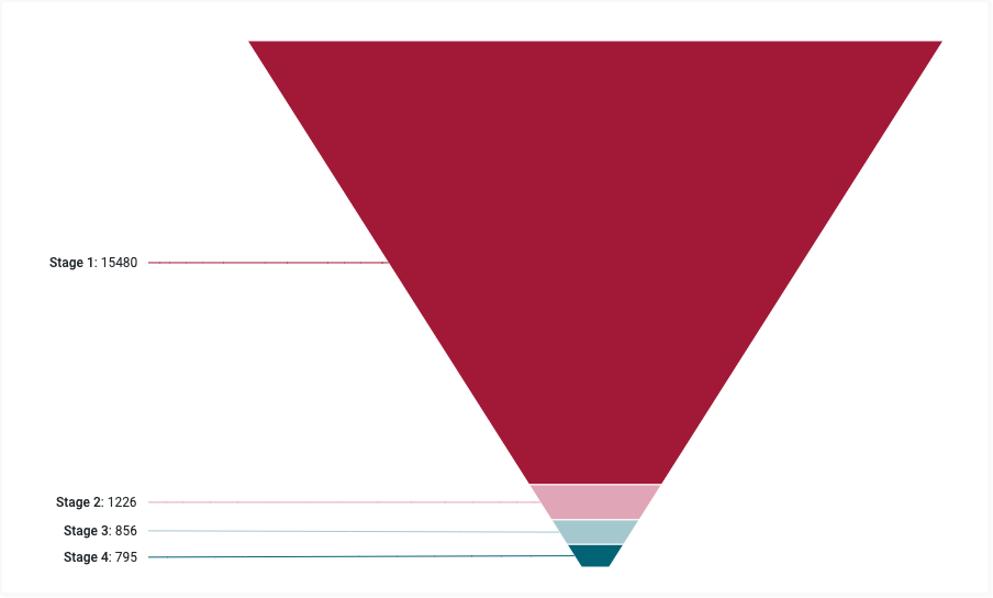 By default, the labels of each funnel stage correspond directly to the dimension values. You can use the Chart Config Editor to modify these labels. For example, consider a funnel with four stages with the following labels: