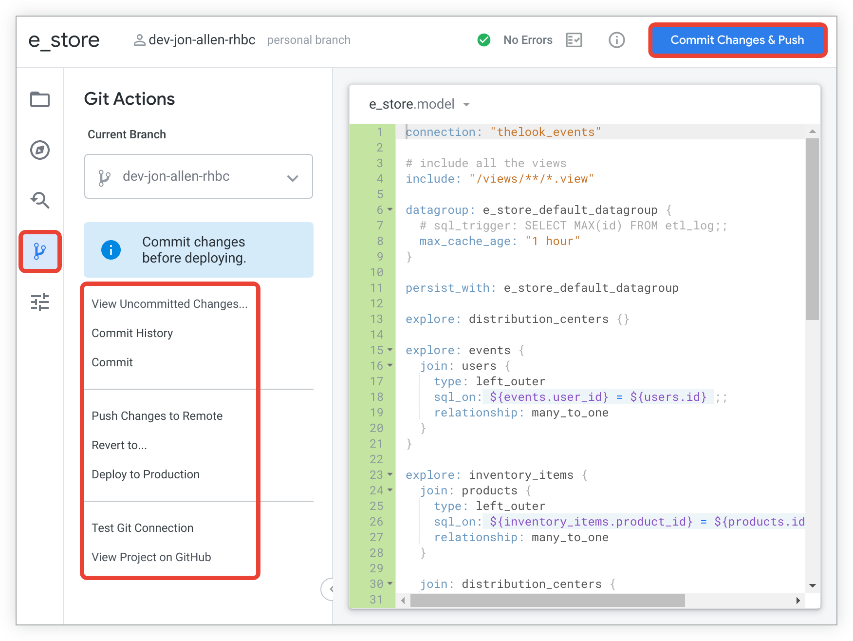 | Esegui il commit | Dopo aver apportato e salvato le modifiche al progetto LookML, utilizza il pulsante Esegui il push e il commit delle modifiche per eseguire il commit delle modifiche nel ramo locale e il push in produzione. Per ulteriori informazioni, consulta la pagina della documentazione Utilizzo del controllo delle versioni e del deployment. | Riquadro Azioni Git |