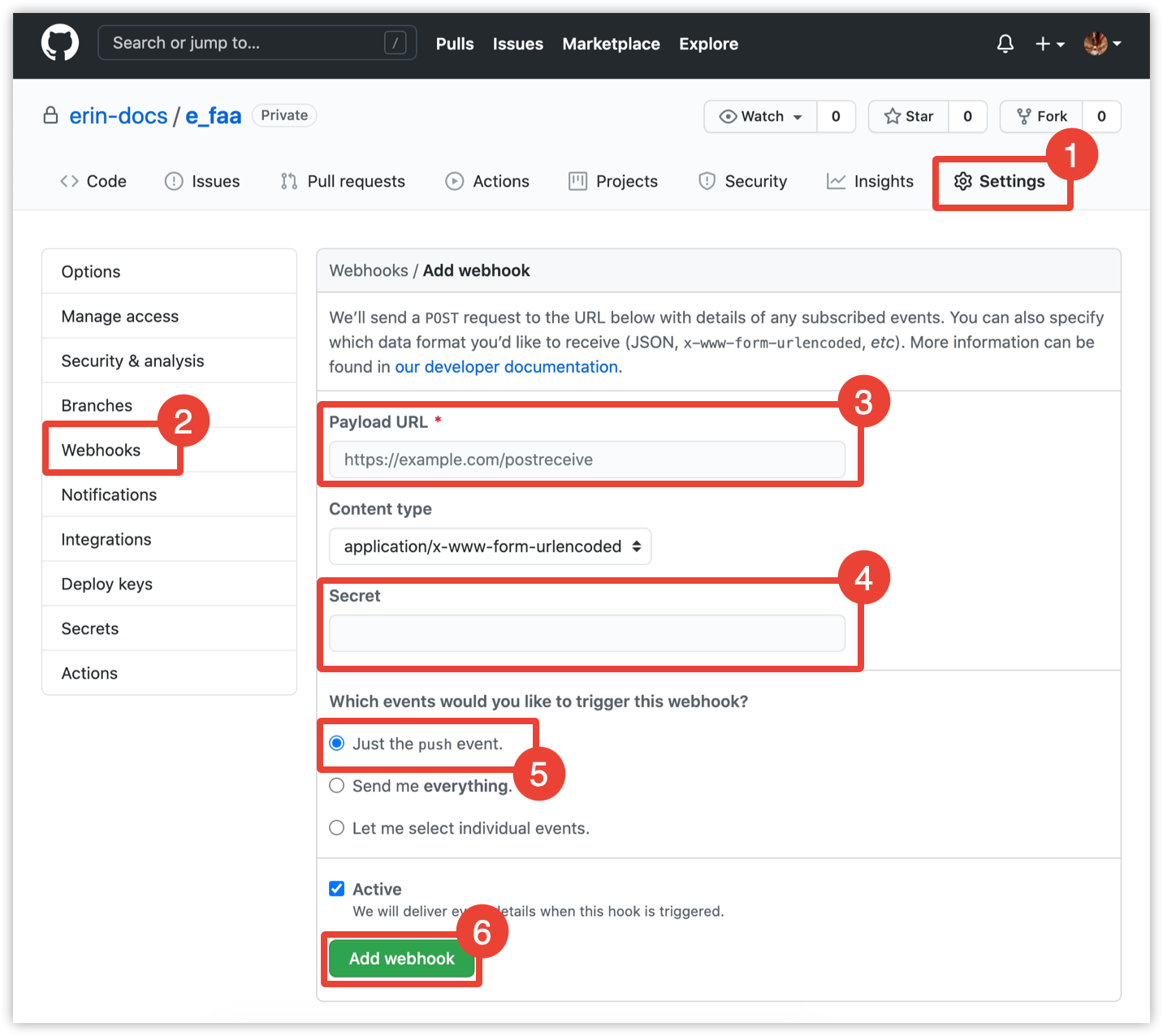 - Klicken Sie auf Add webhook (Webhook hinzufügen).