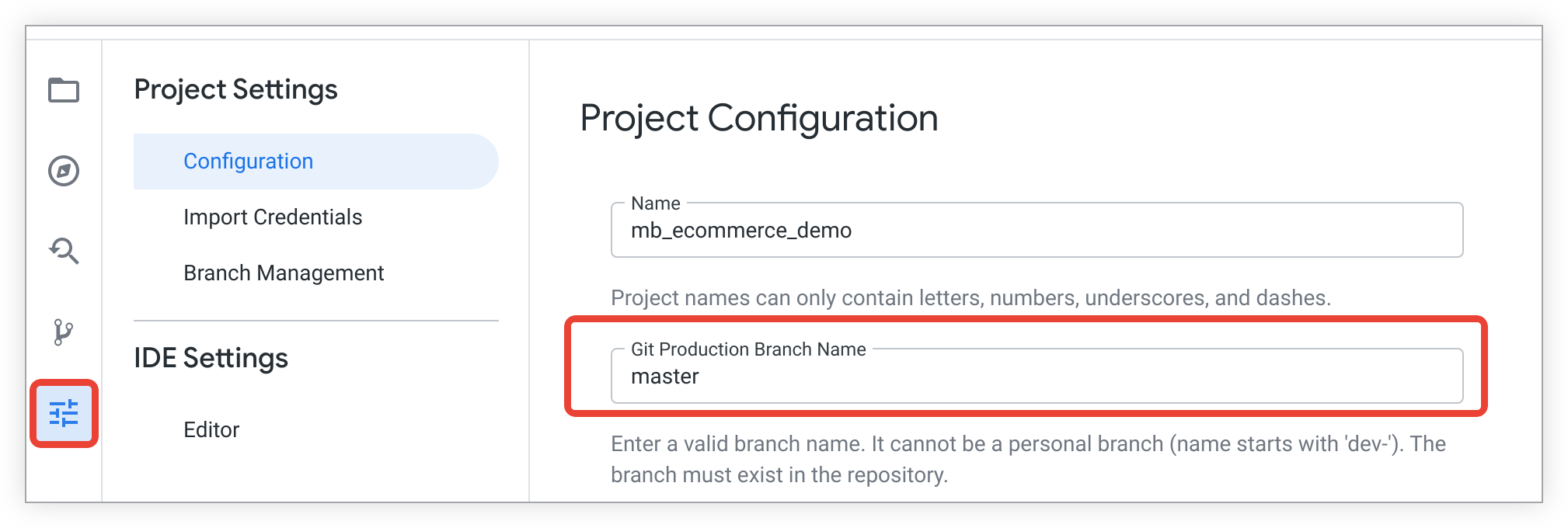 - Ask all developers on the Looker project to commit their changes and merge their branches to the existing production branch, and then pause their work until the Git production branch name is updated and saved in the Looker project configuration.