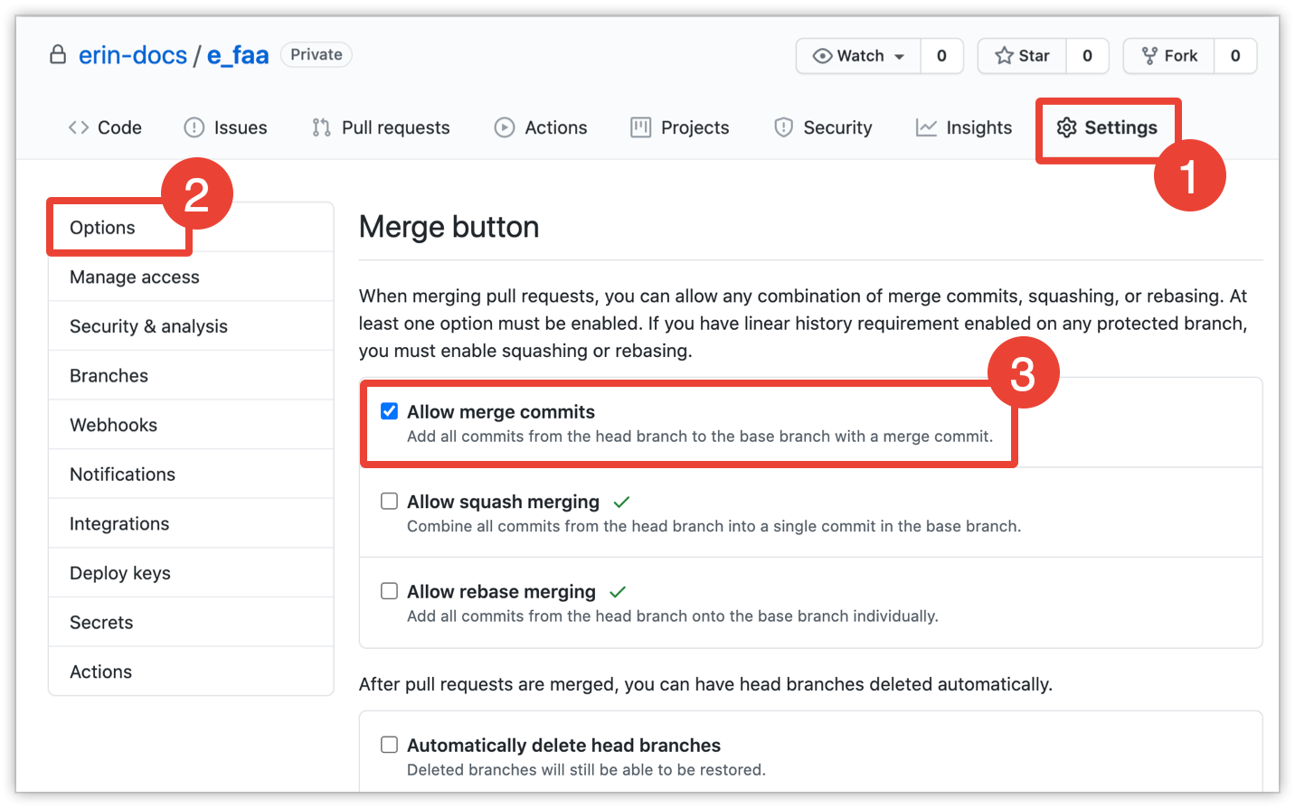 Looker는 스쿼시 병합 또는 리베이스 병합을 지원하지 않으므로 개발자는 이러한 옵션을 사용해서는 안 됩니다. 가능하면 저장소에서 이러한 옵션을 사용 중지하는 것이 가장 좋습니다. GitHub 저장소에서 이러한 옵션을 사용 중지하려면 다음 단계를 따르세요.