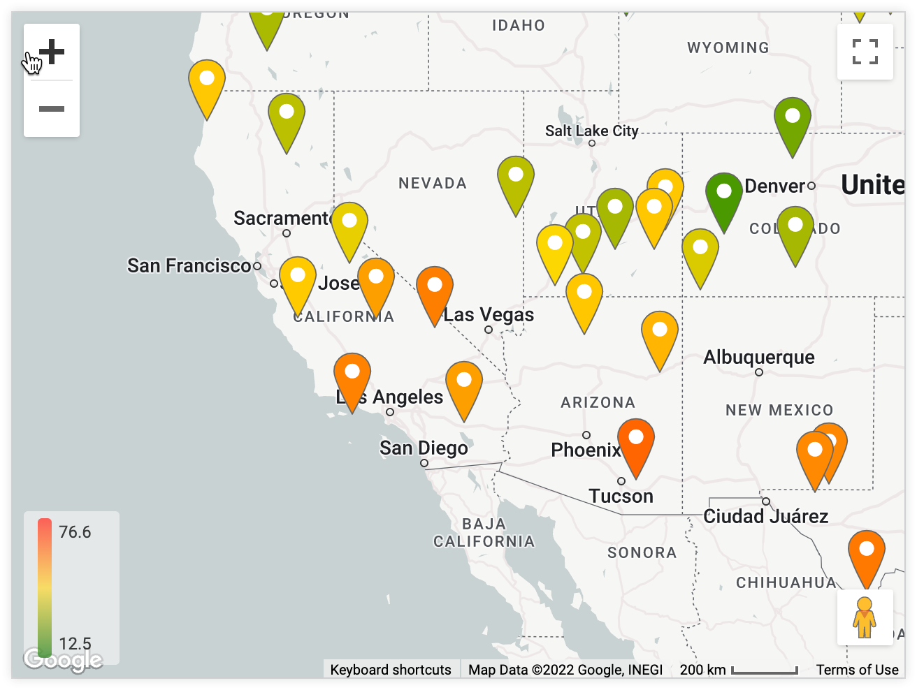 Pour afficher les données d'une requête sous forme de grille de carte de densité, Looker divise la carte visible en carrés égaux, puis calcule les valeurs de vos données qui correspondent à chaque carré. Les carrés sont colorés en fonction d'une mesure de votre choix. Si vous effectuez un zoom avant ou arrière sur cette carte, Looker recalculera la grille afin que la précision soit adaptée au niveau de zoom.