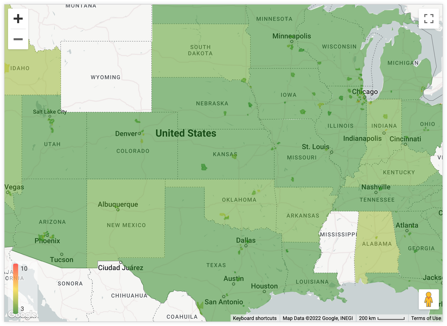 为了以热图网格的形式显示查询中的数据,Looker 会将可见地图划分为大小相等的正方形,然后计算数据中的哪些值适合每个正方形。系统会根据您选择的指标为方块着色。放大或缩小此地图会促使 Looker 重新计算网格,以便粒度与缩放级别相适应。