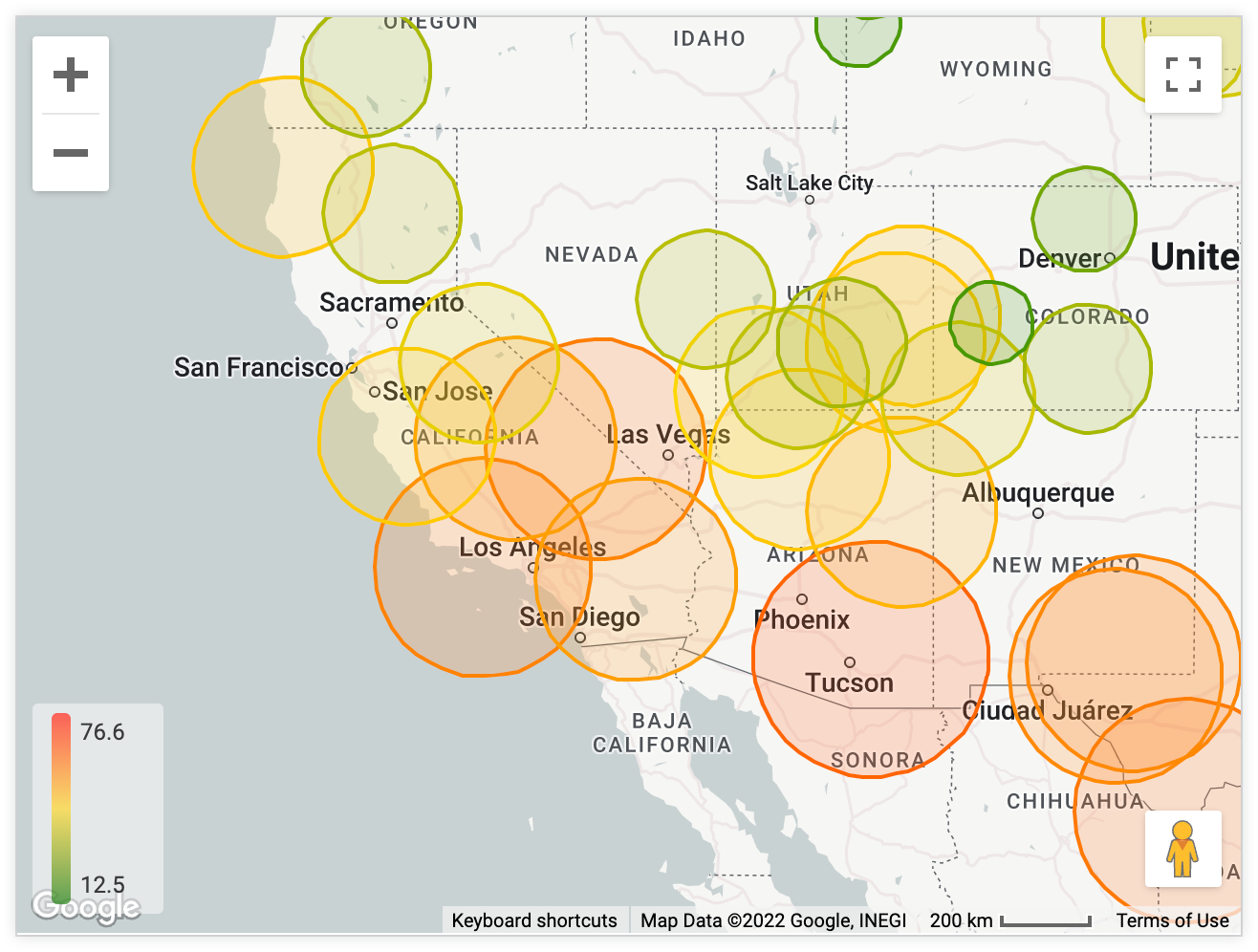 - 圆圈:地图上的点以大小和颜色各异的圆圈显示。