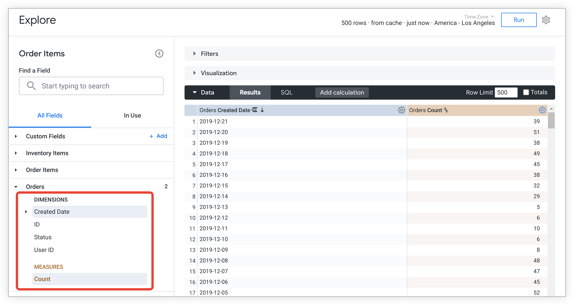 Looker에서 필드는 페이지 왼쪽의 필드 선택도구의 Explore 페이지에 나열됩니다. 필드 선택 도구에서 뷰를 펼쳐 해당 뷰에서 쿼리할 수 있는 필드 목록을 표시할 수 있습니다.