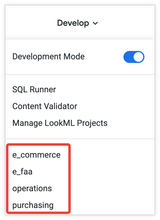 Looker의 개발 메뉴에서 프로젝트에 액세스할 수 있습니다(자세한 내용과 기타 옵션은 프로젝트 파일 액세스 참조).