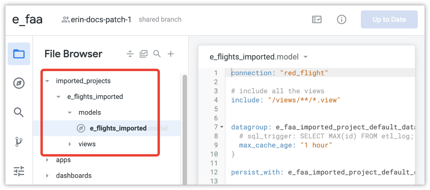 If you import a project, the Looker IDE automatically creates an imported_projects folder. Files from both local projects and remote projects are listed in the imported_projects folder. Select an imported project file from the list of files in the imported_projects to view that file's contents.