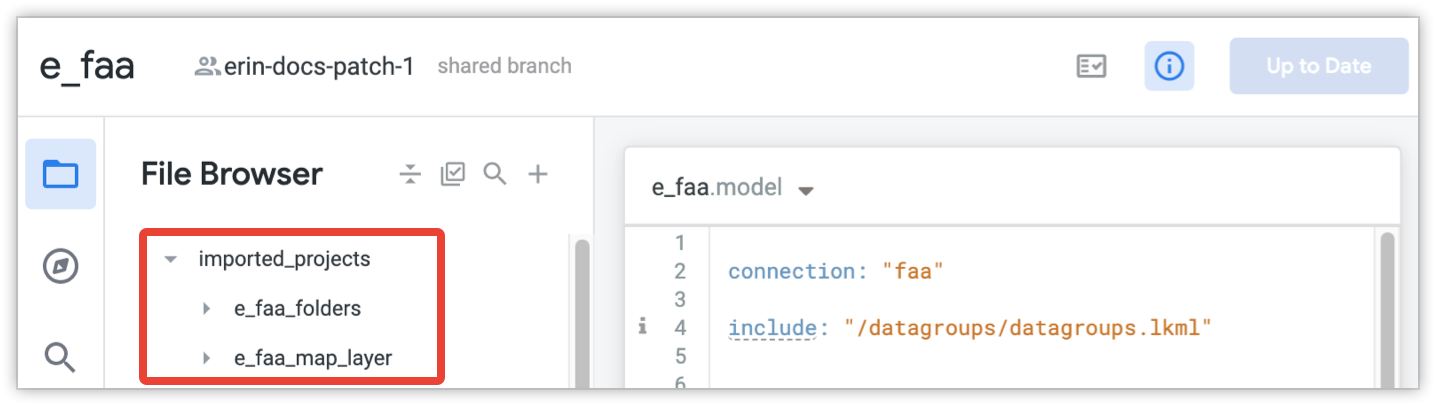 In der Looker-IDE werden importierte Projektdateien im Ordner imported_projects des linken Navigationsbereichs angezeigt. Sie können eine importierte Projektdatei auswählen, um ihren Inhalt aufzurufen.