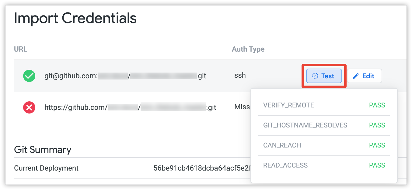 Una vez que hayas superado las pruebas de conexión y te hayas conectado al repositorio, en la sección Import Credentials (Importar credenciales) aparecerá una marca de verificación verde junto al nombre del repositorio.