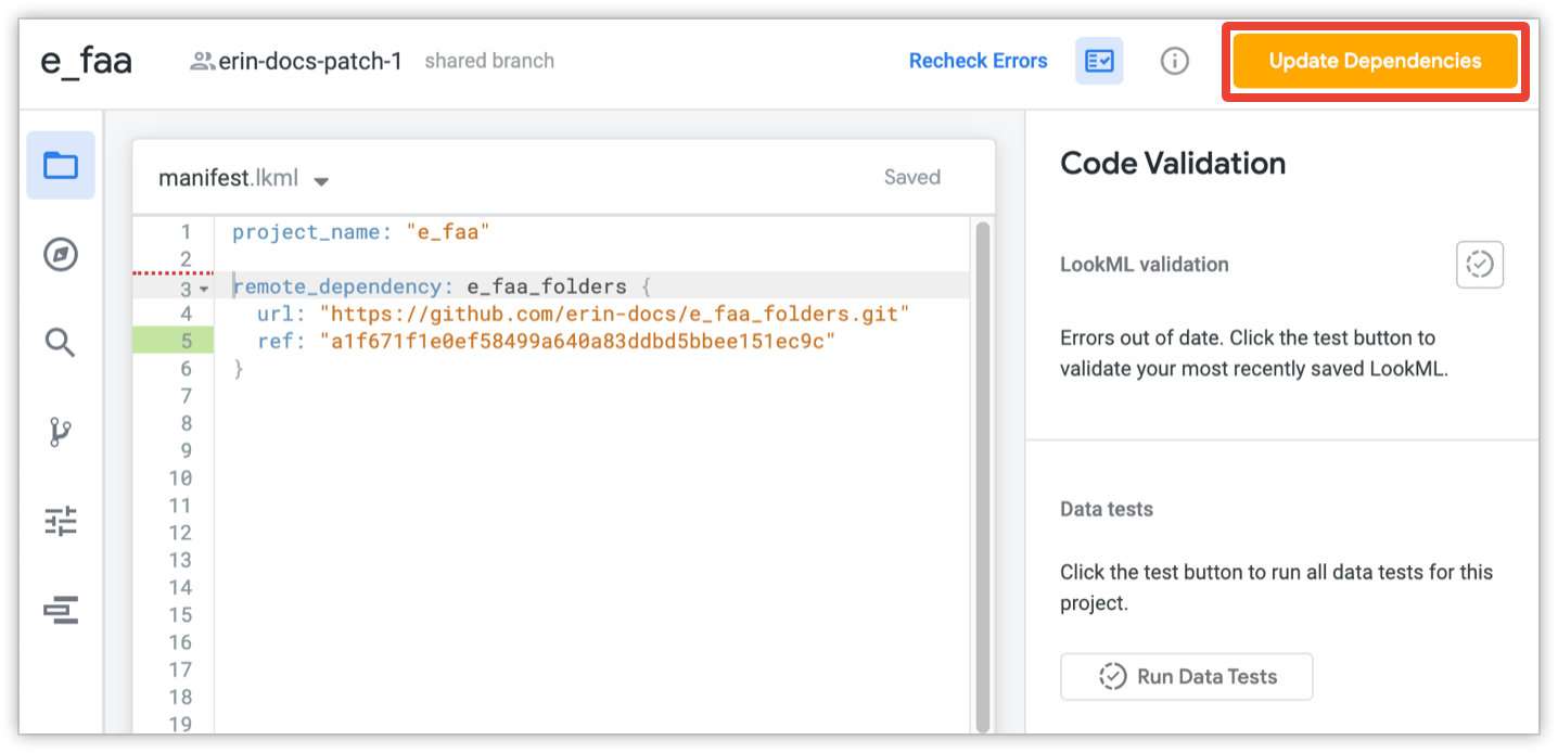 최신 파일이 있으면 LookML을 검증하여 프로젝트의 모든 참조가 업데이트된 원격 프로젝트 파일에서 작동하는지 확인할 수 있습니다. 그런 다음 손상된 참조를 수정하고 사용자에게 다운타임 없이 변경사항을 배포할 수 있습니다.