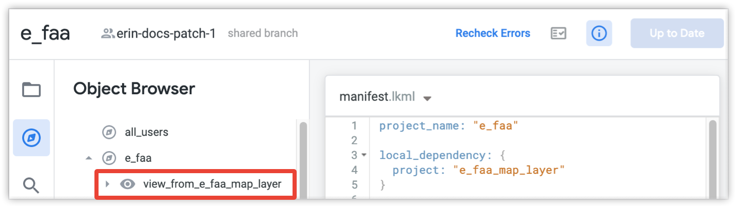 Sie können auch Objekte aus importierten Projektdateien, die im aktiven Projekt enthalten sind, im Objektbrowser ansehen. Sie können über die Navigationsleiste der Looker IDE auf den Objektbrowser zugreifen.