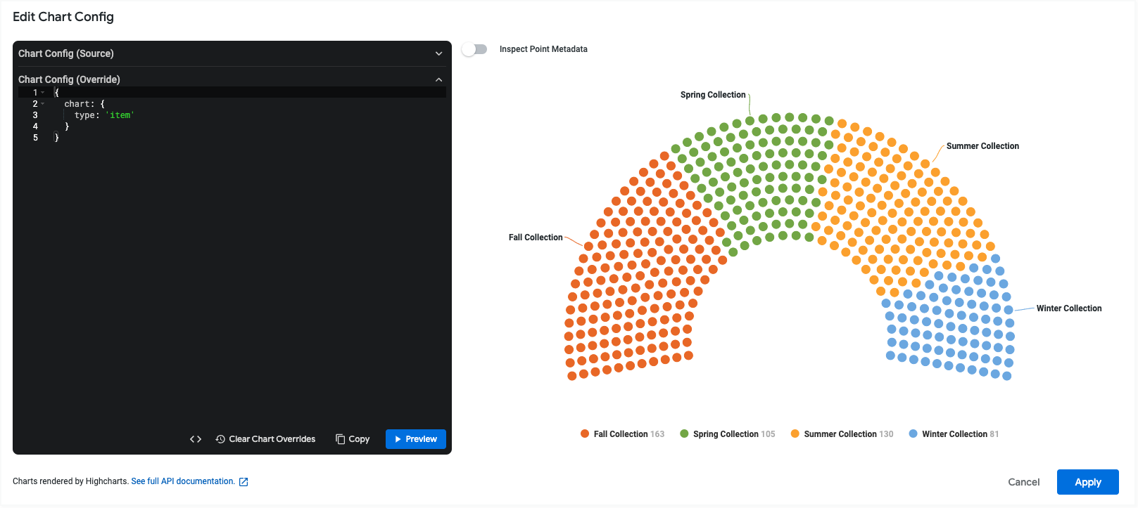 For example, you can create an item chart that shows the Inventory Item Count measure value over several different Seasonal Collection dimension values. The dots will be colored according to the dimension values.