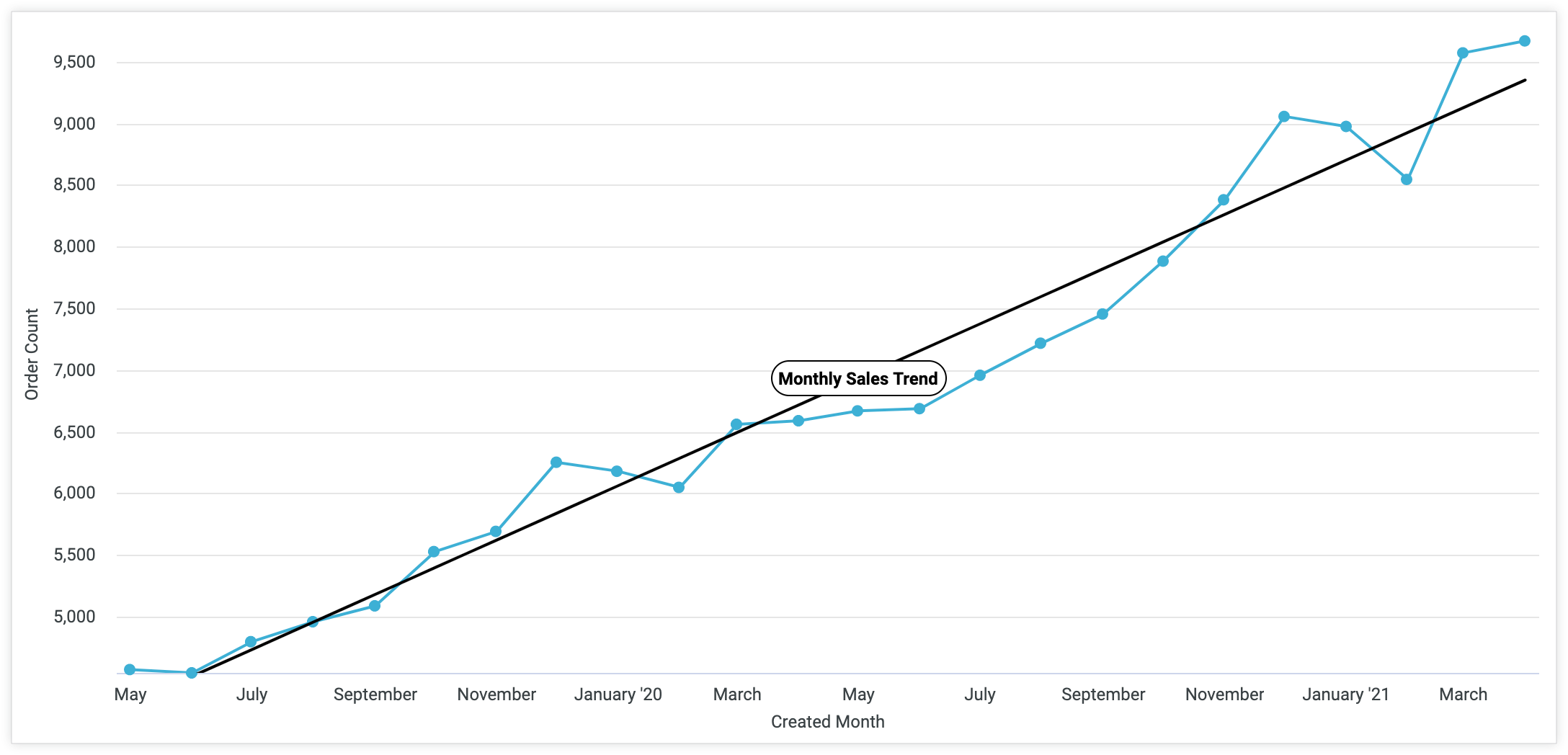 Trend lines show the prevailing direction of the data in a chart. If your chart can support a trend line, you will see the Add Trend Line button in the Y menu options.