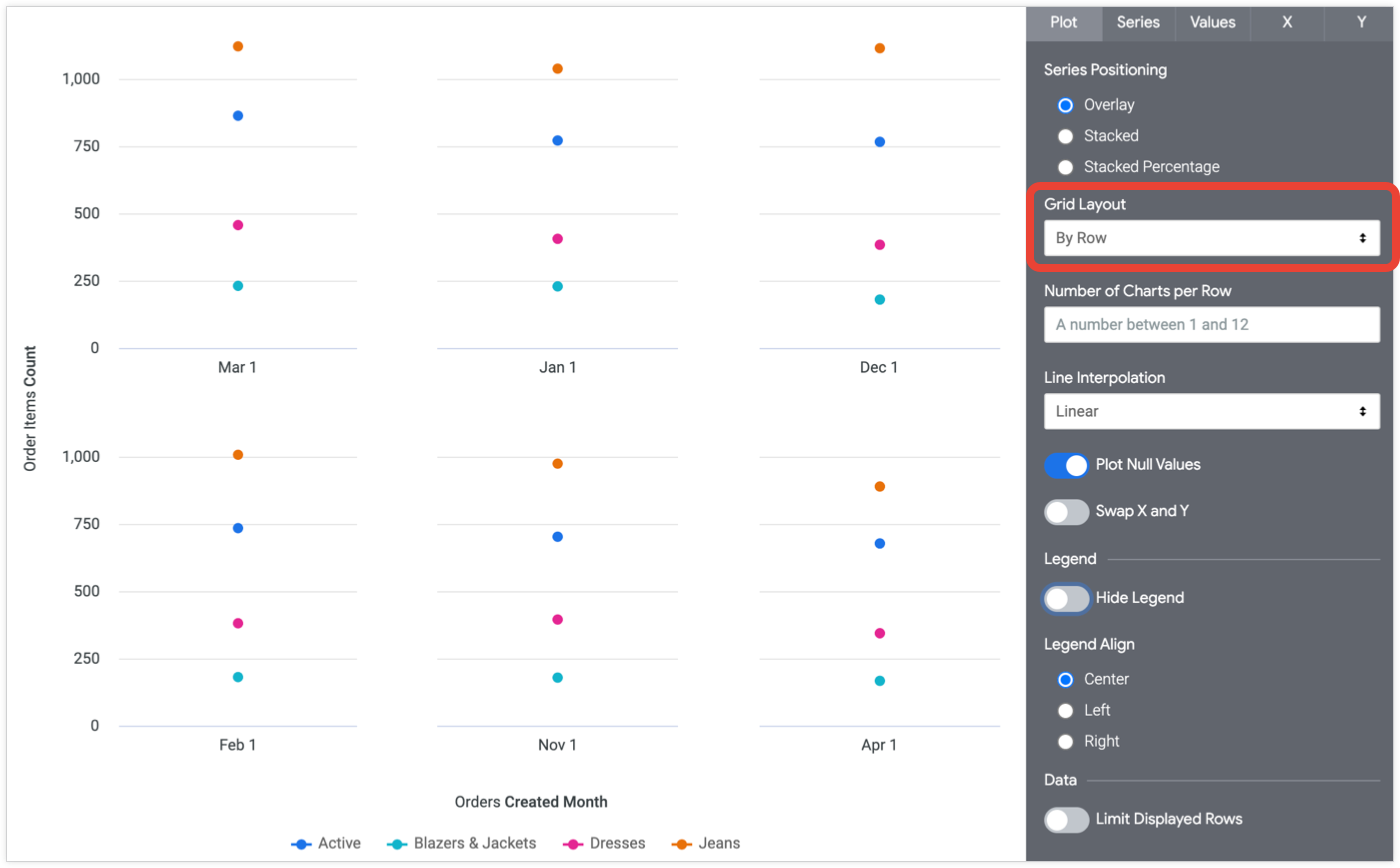 When you select By Pivot or By Row from the drop-down menu, the Number of Charts per Row option appears. You can input a number between 1 and 12. If you do not input a number, Looker arranges the charts as evenly as possible.