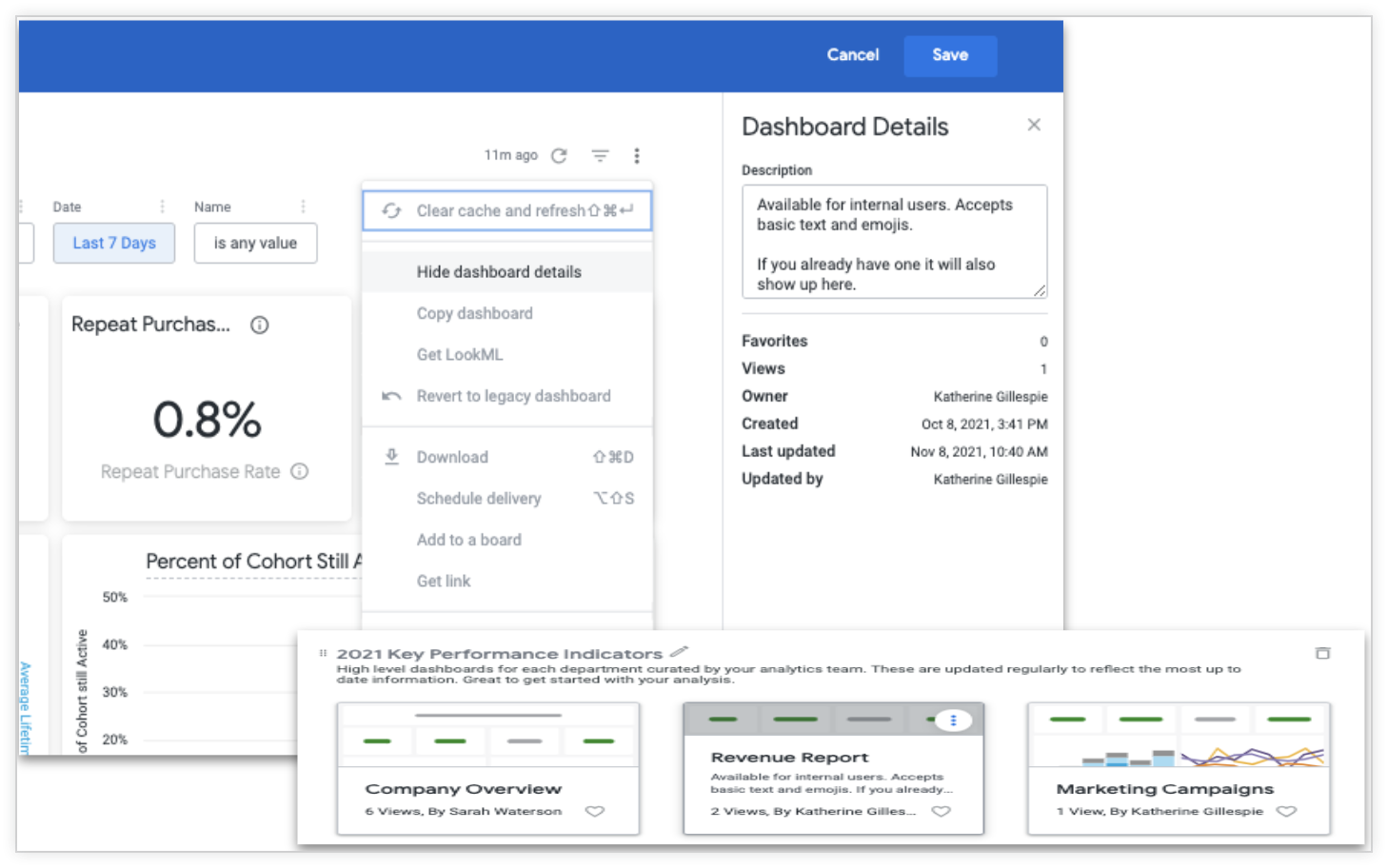 - LookML-Dashboards können nicht kopiert, aktualisiert, umbenannt, für die Lieferung eingeplant oder aus einem Ordner in den Papierkorb verschoben werden.