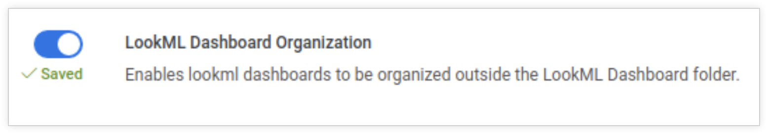 - Wenn Sie die Labs-Funktion „LookML Dashboard Organization“ aktivieren, können Sie LookML-Dashboards aus dem Standardordner LookML-Dashboards verschieben.