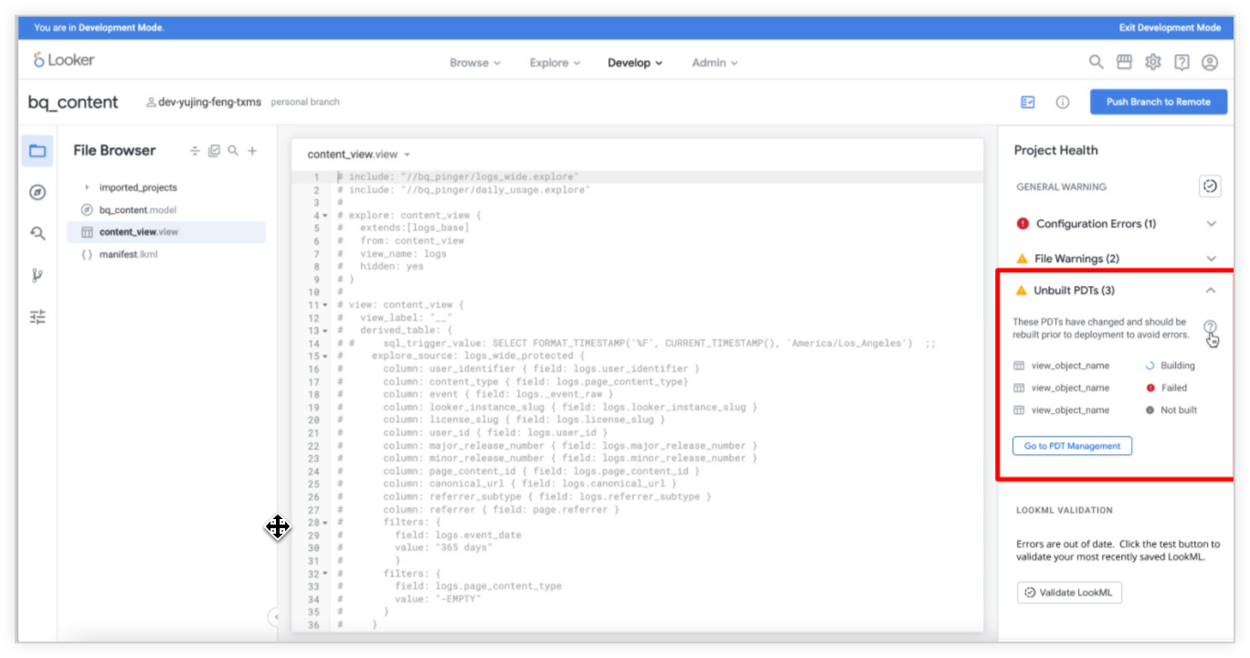 - Dazu musste bislang das LookML/SQL für jede PDT manuell überprüft werden.
