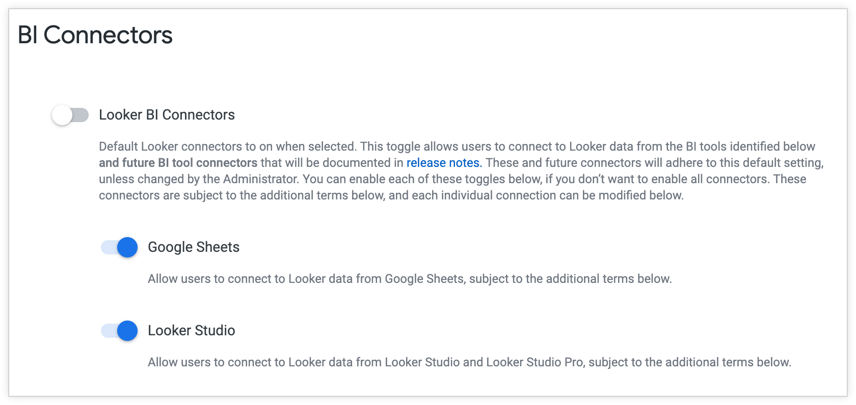 Looker admins must enable the feature on the BI Connectors admin page.