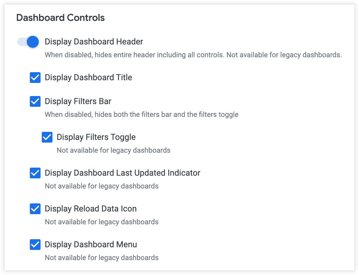 This feature is now enabled by default, and it lets admin users display and hide dashboard header elements on embedded dashboards.