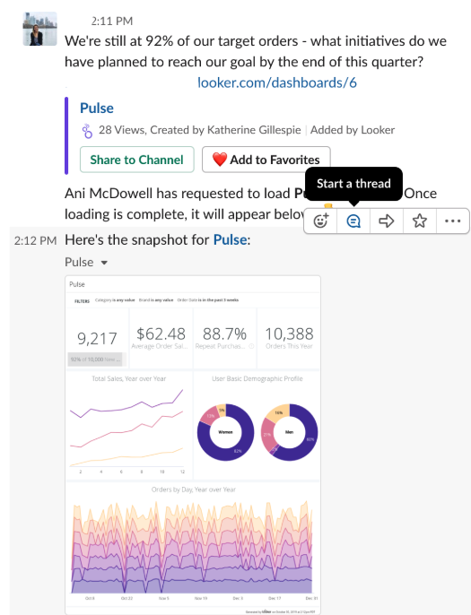 science Introduced support for a new Slack integration for Looker-hosted instances. This new integration allows users to send content through DMs and to public and private channels via OAuth. Learn more.