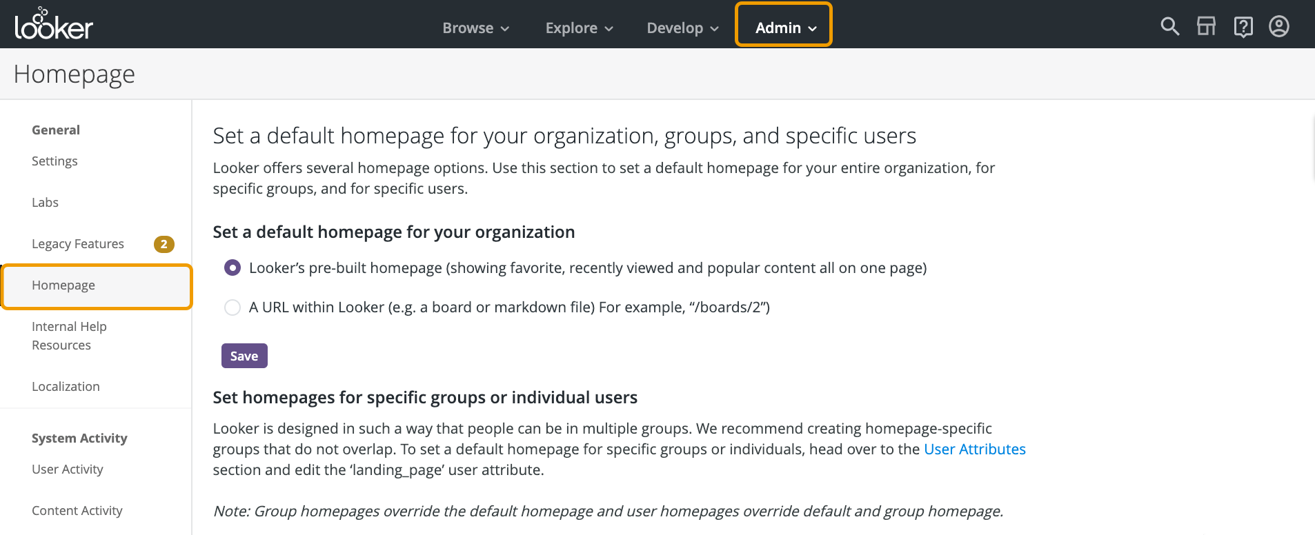 - Looker 管理者は、Admin 設定で特定のチームまたは個人のデフォルトのホームページを設定できるようになりました。