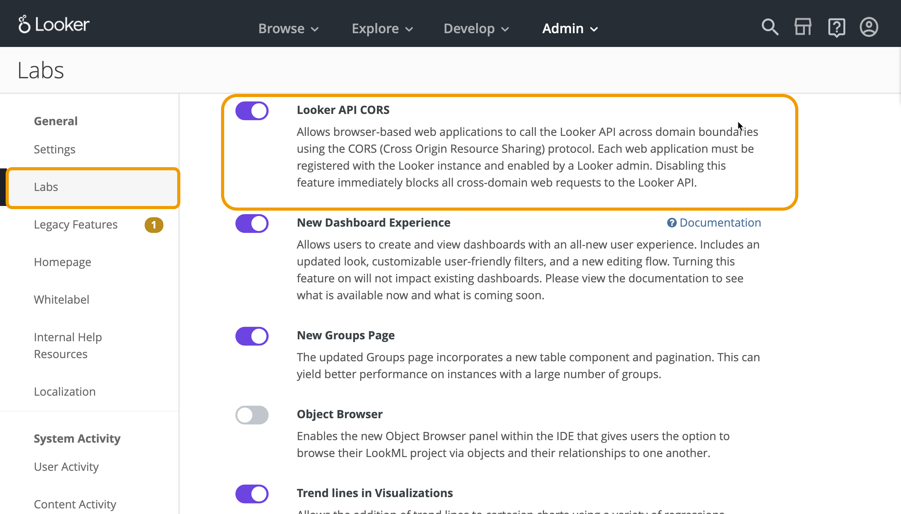 ベータ版の Looker Labs 機能である System Activity Model により、システムアクティビティダッシュボードを有効にすることができます。