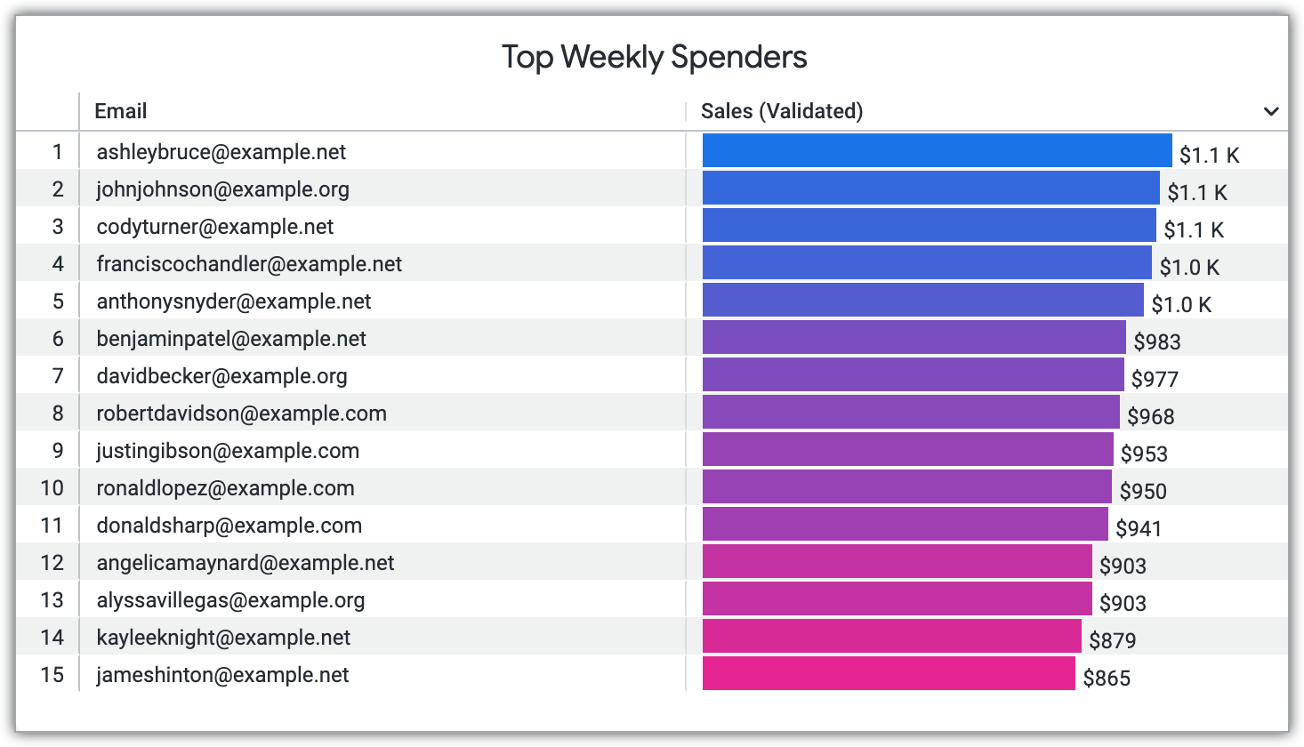 Em seguida, selecione campos da análise detalhada E-commerce intermediário e defina a visualização do bloco Principais gastos semanais, que mostra os 15 principais clientes por vendas nas últimas quatro semanas. Para selecionar campos e visualizar os dados de amostra, siga estas etapas: