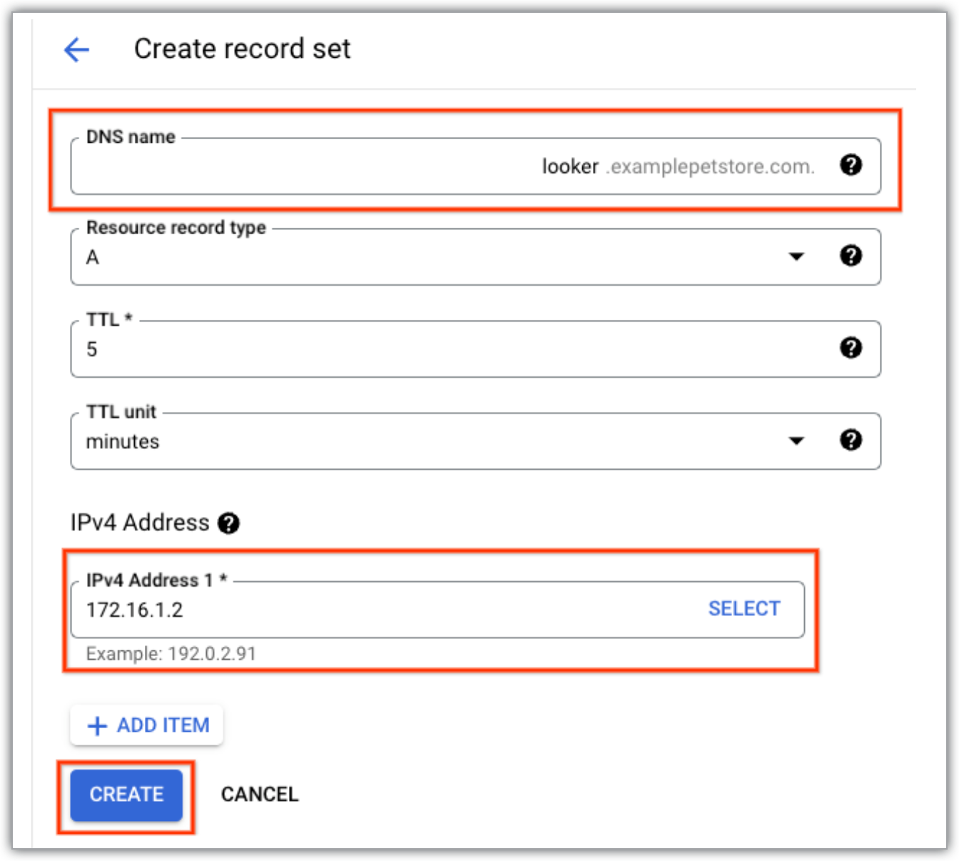 2. Fügen Sie der privaten Zone einen DNS-A-Eintrag für die benutzerdefinierte Domain hinzu, der aus der Ingress-IP-Adresse der Looker (Google Cloud Core)-Instanz besteht. Für den A-Eintrag wird der vollständig qualifizierte Domainname (Fully Qualified Domain Name, FQDN) verwendet, den Sie als benutzerdefinierte Domain für Looker (Google Cloud Core) konfiguriert haben.