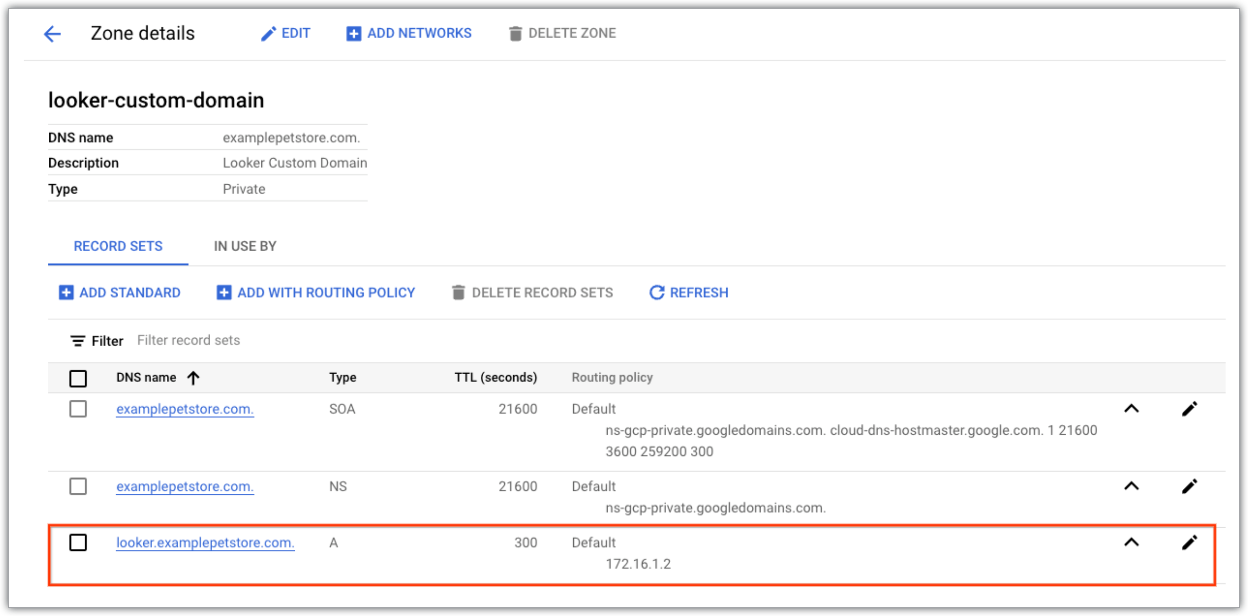 2. Add a DNS A record for the custom domain in the private zone, consisting of the ingress IP address of the Looker (Google Cloud core) instance. The A record uses the Fully Qualified Domain Name (FQDN), the same as what you configured as the Looker (Google Cloud core) custom domain.