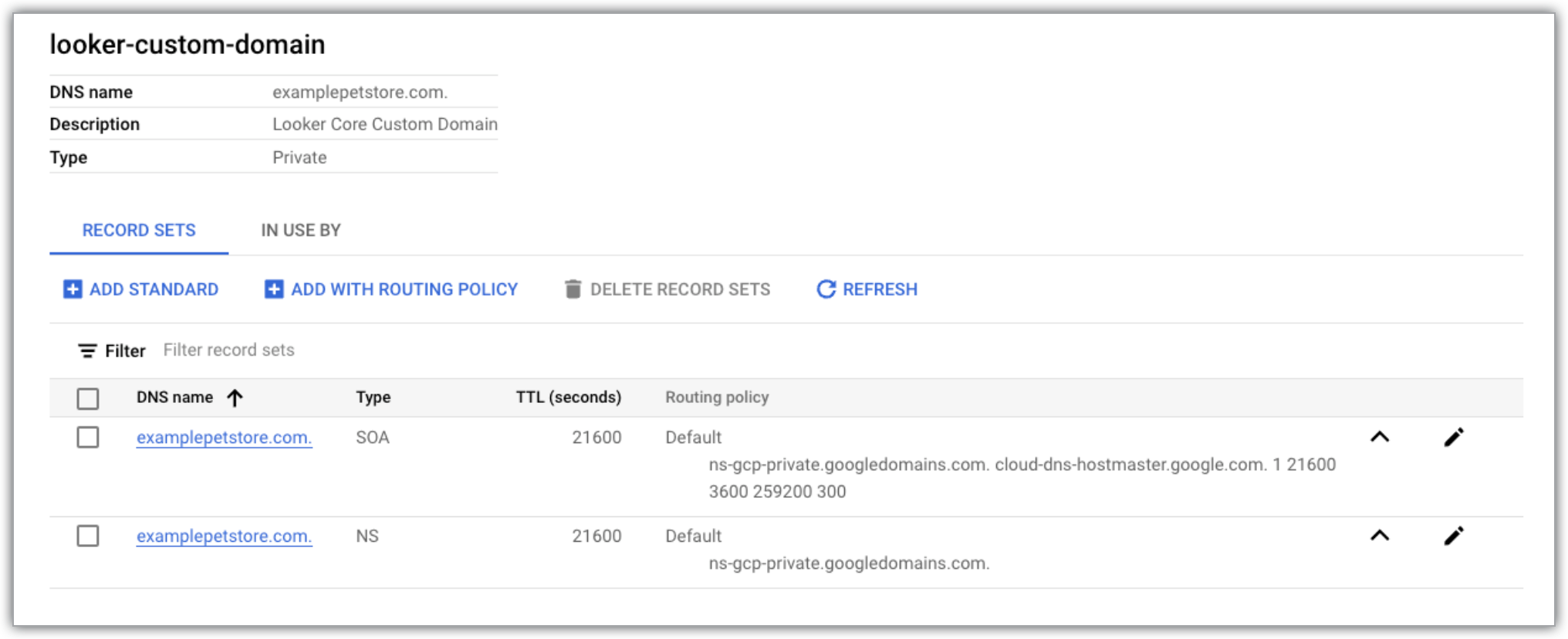 Create a Cloud DNS private zone that is visible to the VPC in which the Looker (Google Cloud core) instance is located. The Cloud DNS private zone will be used by the VPC and the on-premises hosts for DNS resolution to reach the Looker (Google Cloud core) UI. The name of the zone should match the custom domain.