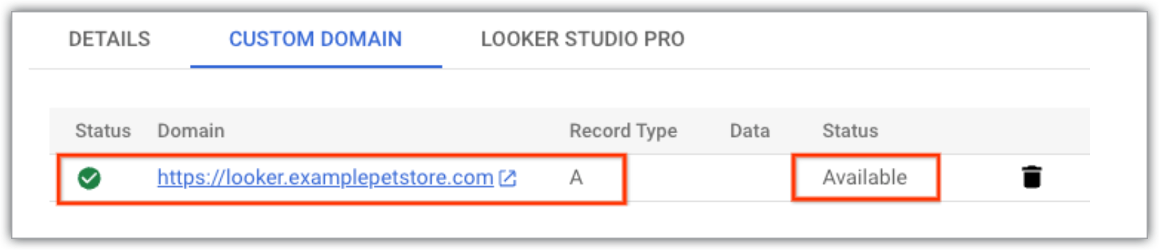 Once your custom domain is set up, it is displayed in the Domain column on the CUSTOM DOMAIN tab of the Looker (Google Cloud core) instance details page in the Google Cloud console.