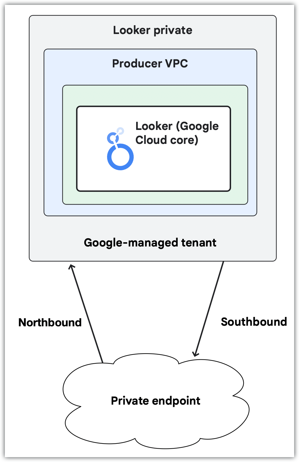 Dans une configuration de connexions privées, Looker (Google Cloud Core) n'a pas d'URL publique. Vous contrôlez tout le trafic entrant (nord) et tout le trafic sortant (sud) sera acheminé via votre VPC.
