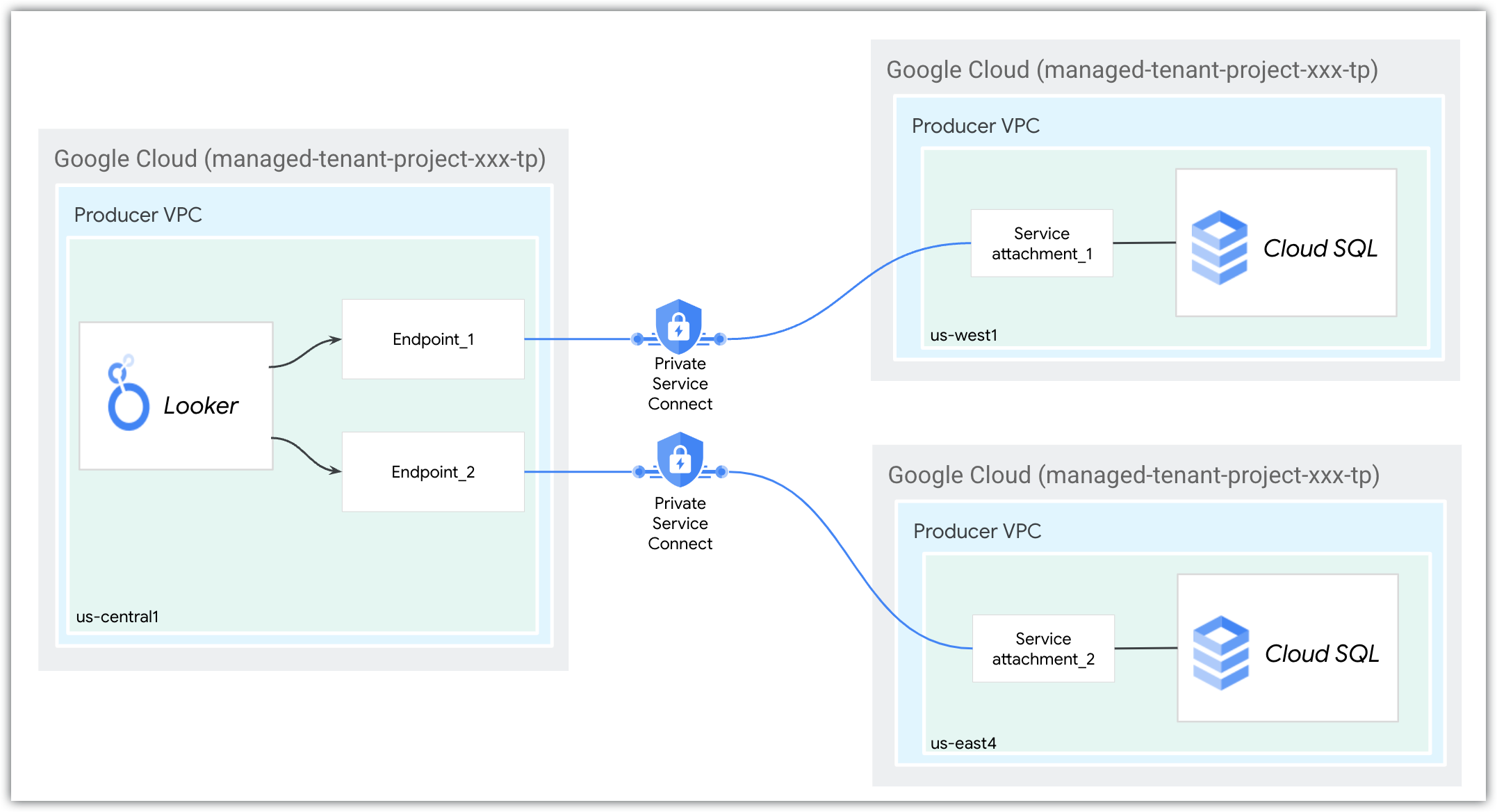 Puoi stabilire una connessione in uscita da Looker (Google Cloud core) ai producer di servizi in qualsiasi regione. Ad esempio, se hai istanze Private Service Connect di Cloud SQL nelle regioni us-west1 e us-east4, puoi creare una connessione in uscita da un'istanza Private Service Connect di Looker (Google Cloud core) di cui è stato eseguito il deployment in us-central1.