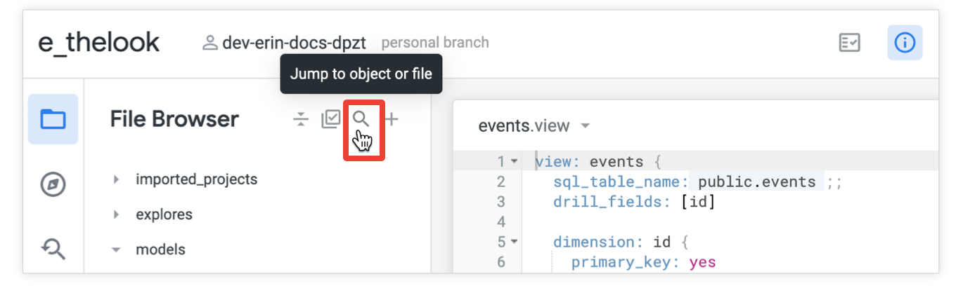Di Looker IDE, Anda dapat melakukan penelusuran cepat untuk langsung membuka objek LookML dan file project menggunakan fitur Buka objek atau file. Klik ikon Buka objek atau file dari penjelajah file atau penjelajah objek, atau gunakan pintasan keyboard Command-J (Mac) atau Ctrl+J (Windows).