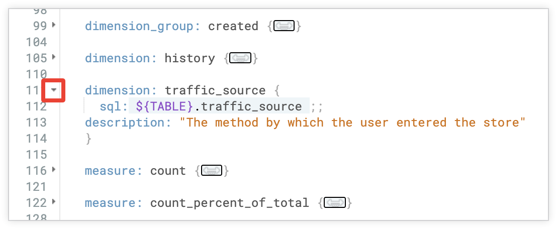 Nel margine accanto all'inizio di ogni parametro LookML di primo livello nel file viene visualizzata una piccola freccia. Selezionando questa freccia, la sezione di LookML viene compressa o espansa, in modo da poter concentrarti solo su sezioni specifiche.