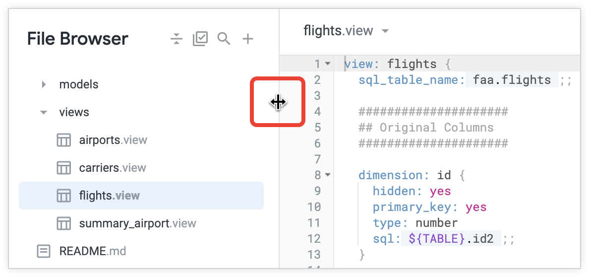 4. Riquadro dell'editor IDE: l'editor per i file LookML. L'editor viene visualizzato quando nella barra di navigazione dell'IDE è selezionato Browser file o Browser oggetti. Per ulteriori informazioni sull'editor, consulta Funzionalità di modifica dell'IDE di Looker.