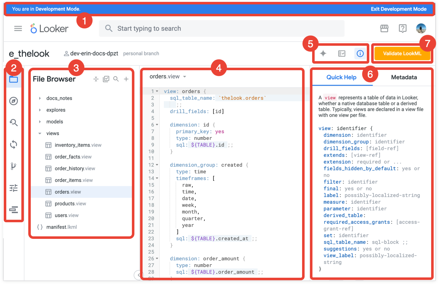 1. Banner della modalità di sviluppo: questo banner indica che ti trovi in modalità di sviluppo, in cui puoi apportare modifiche ai file LookML e visualizzare l'anteprima dell'impatto sui contenuti della tua istanza. Puoi fare clic sul link Esci dalla modalità di sviluppo nel banner per passare alla modalità Produzione.