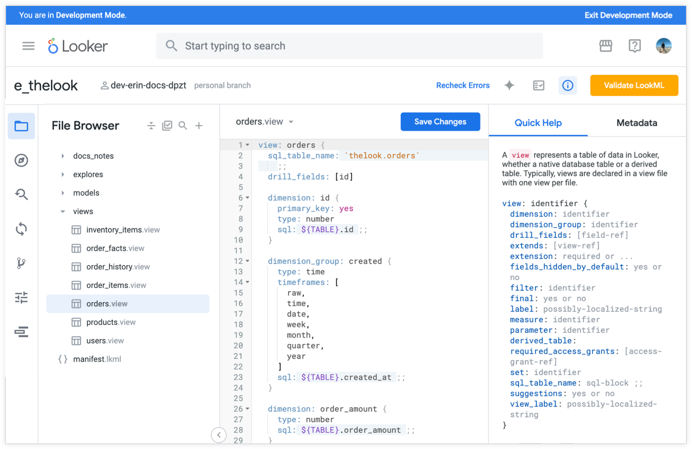 以降のセクションでは、LookML での開発に役立つ Looker IDE の編集機能について説明します。