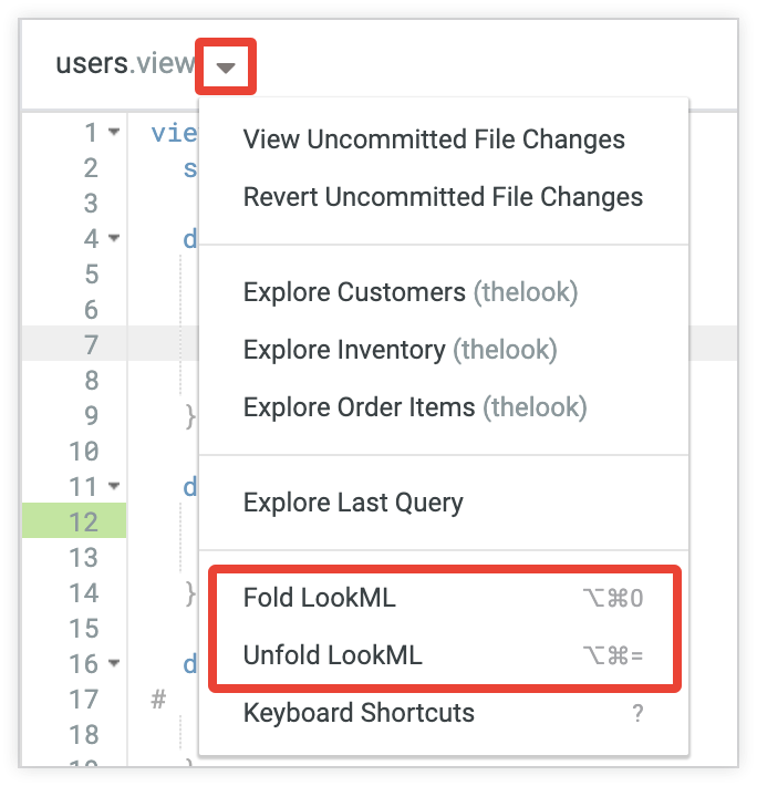 단축키를 사용하여 LookML을 접거나 펼칠 수도 있습니다.